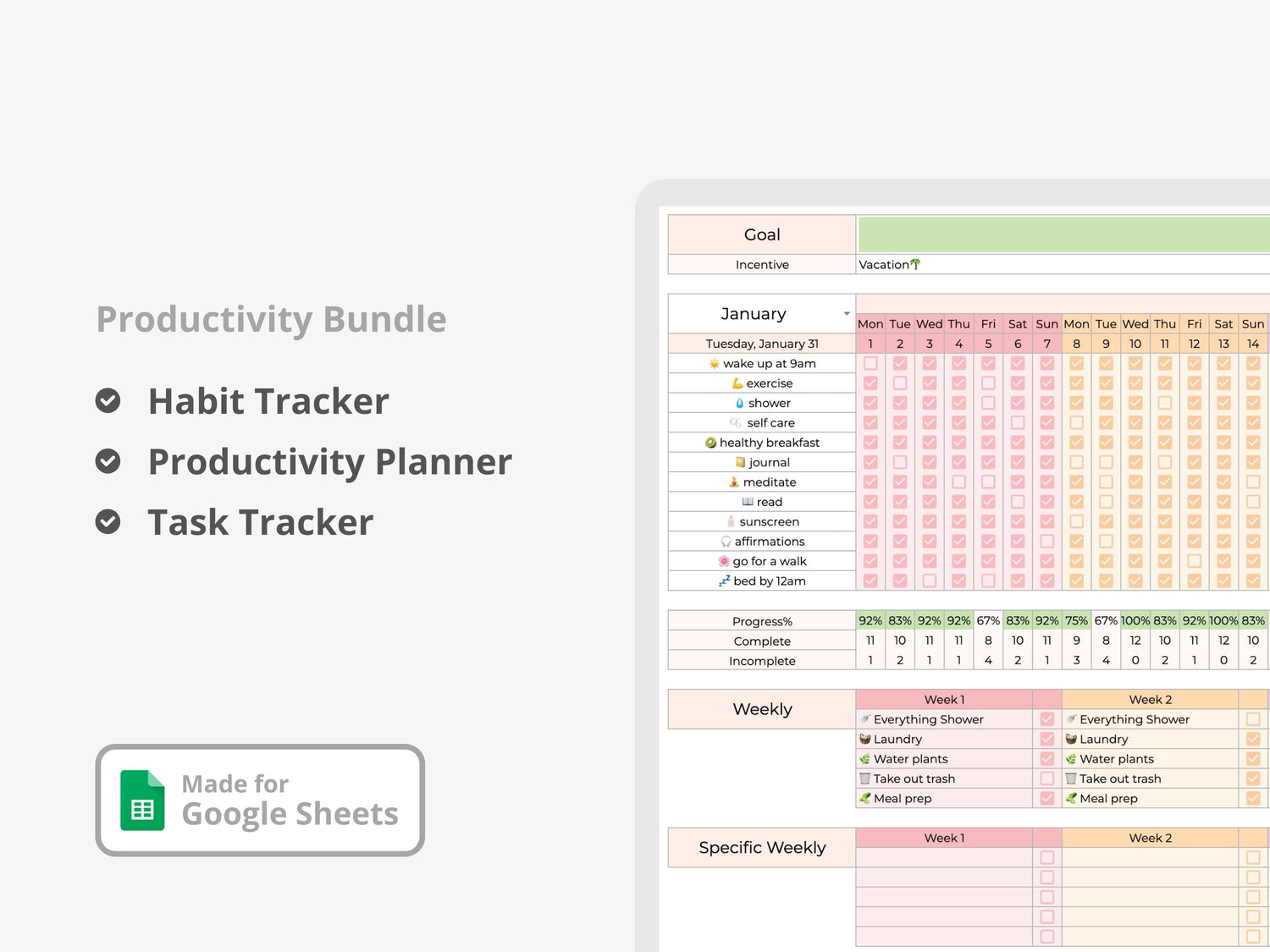 Introducing the Productivity Bundle, your comprehensive toolkit for exceptional daily organization and efficiency. This all-in-one solution combines a Habit Tracker, Productivity Planner, and Task Tracker to streamline your life.